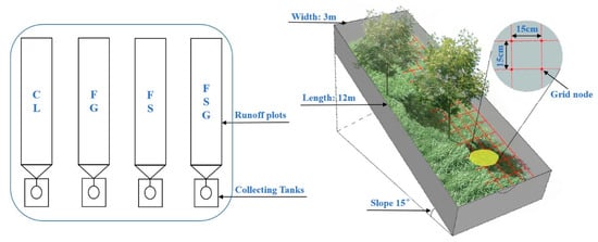 We divided the runoff plots into two groups, four in each group, based on the level of potential karst rocky desertification (PKRD) and mild karst rocky desertification (MKRD) of the study area. It should be noted that the classification of rocky desertification levels is mainly based on differences in the bedrock exposure rate, soil layer thickness, lithological conditions, etc. The runoff plot was 12 m long and 3 m wide, and the slope was approximately 15 degrees (Figure 1). On the basis of a field survey of land use, the vegetation of each group was set as CL: cultivated land (Corn), FG: forage grass (Ryegrass), FS: forest and shrub–grass mixed planting (Walnut, Rosa roxburghii), and FSG: forest shrub–grass mixed planting (Walnut, Rosa roxburghii, Ryegrass). All crops were planted or transplanted in the same year. At the same time, the synchronous comparative monitoring experiment of soil loss was carried out based on the aforementioned groupings.