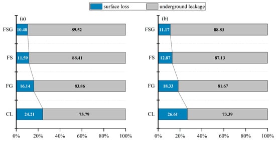 Additionally, Figure 4 shows that the more complex the vegetation combination is, the lower the contribution rate of soil erosion to surface loss and the higher the contribution rate of underground leakage. The FSG type, which is a mixed planting of forest, shrub, and grass, had the lowest surface loss rate and the highest underground leakage rate, while the monoculture corn field had the highest surface loss rate and the lowest underground leakage rate. This result may be due to the increase in surface vegetation coverage caused by the mixing of forest, shrub, and grass, which enhances the effect on leaf interception and plant root network fixation, thereby avoiding direct erosion via raindrops and weakening the direct erosion of surface soil via precipitation and surface runoff. The soil and water conservation effect of mixed vegetation types are significantly better than that of single crop species.