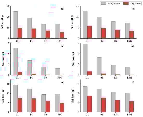 Soil loss of surface and underground in dry and rainy seasons. (a): Total soil erosion of PKRD, (b): Total soil erosion of MKRD, (c): Surface soil erosion of PKRD, (d): Surface soil erosion of MKRD, (e): Underground soil erosion of PKRD, (f): Underground soil erosion of MKRD.