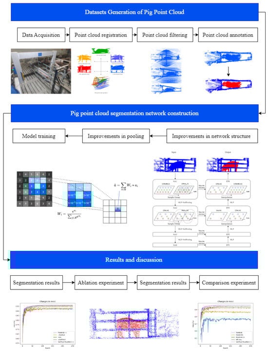 With the rapid development of computer vision and artificial intelligence, 3D scene analysis has emerged as a critical research area across various disciplines. Among them, point cloud data, as a representation that can accurately capture 3D geometric information, has received widespread attention. Point cloud data consists of many discrete points, each containing essential information, such as the position, shape, and surface features of an object, so point cloud segmentation has been widely used in 3D computer vision scenarios [1]. For example, good results have been achieved in urban planning and design, medical data processing, architectural modeling, precision flight of unmanned aircraft, and autonomous driving [2,3,4,5,6,7]. In intelligent agriculture, a depth camera is used to collect the point clouds of plants. Then, the collected data are sent to neural networks to segment the leaves and stems of plants, which helps in selective breeding and trait analysis [8]. A secondary segmentation method for point clouds based on 2D images and depth information was proposed to extract fruits’ contours in complex backgrounds [9]. In animal husbandry, an efficient and automated method was developed for measuring beef cattle body dimensions, facilitating the collection of reliable phenotypic data throughout the fattening process and directly integrating it into the breeding strategy [10]. A 3D surface reconstruction and pig size measurement system based on a multi-view RGB-D camera was developed to measure pig dimensions [11]. In these applications, accurate point cloud segmentation is one of the critical steps towards object recognition, environment perception, and scene understanding.