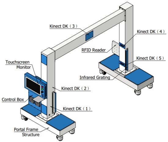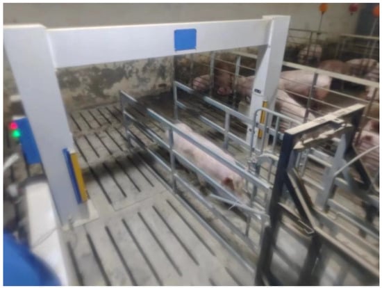 Kinect DK cameras were set up at each of the five positions A, B, C, D, and E of the acquisition channel in the test site. To avoid incomplete data collection, only one pig was allowed to enter the acquisition channel at a time. When the target pig entered the data collection area, the infrared grating was triggered and the trigger signal reached the control box instantly, driving the RFID reader to read the ear tag number of the pig. Point clouds were simultaneously captured from five directions when the valid ear tag was read. After collecting a certain number of times per pig, the pig was herded back to the pen and the start and end times of the collection were recorded corresponding to the ear tag to prevent double collection of the same pig. Finally, pigs that had not been collected were driven into the collection environment. Upon entering the collection area, the collected pig point clouds varied significantly due to individual differences and different postures. Figure 2 shows the CAD framework of the pig three-dimensional point cloud collection device. The data collection and verification scenes are depicted in Figure 3.