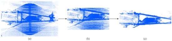 Comparison results of preprocessing before and after point cloud filtering. (a) Raw data; (b) pass-through filtering results; (c) RANSAC results.