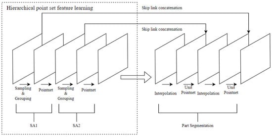 For segmentation networks, PointNet++ adopts an Encoder–Decoder structure, where features are connected through skip link concatenation. Interpolation targets segmentation networks because segmentation results require assigning a semantic label to each point cloud. However, only the features of the down-sampled point cloud are obtained after the SA layer. The purpose of interpolation is to obtain the features of the points ignored during the down-sampling process. Unit PointNet consists of the MLP and Rectified Linear Unit (ReLU) and constitutes the subsequent MLP operation after the max pooling in the PointNet layer.