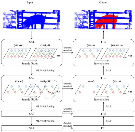As can be seen from Table 1, the improvement of the classical PointNet++ is mainly conducted in 2 aspects: (1) increasing the depth of the model as the deeper model has stronger feature extraction ability and, also, facilitates the smooth reduction in the radius of the receptive field; (2) reducing the radius of the model’s receptive field as the smaller receptive field can improve the model’s ability to perceive the detailed features of the pigs. The structure of the improved point cloud segmentation model for pigs with PointNet++ is shown in Figure 7.