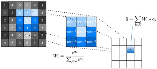 Figure 8 shows the SoftPool down-sampling process. A feature map is input and the colored portion of the map represents the 3 × 3 sized region being sampled. Using the weighting formula, the weight of each element in the selection is calculated and each weight is multiplied with the corresponding activation value and accumulated to obtain the final result, in which the weights are non-linearly transformed along with the corresponding activation values.