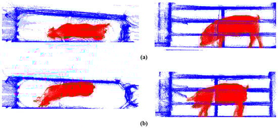 The training dataset was prepared and labeled using CloudComparev2.13 software. According to the localization of the key points, a total of two parts of the pig body and the railings were labeled, sequentially, with the railings marked with “0” and the pig body marked with “1”. As shown in Figure 9, the blue area is the point cloud of the railings containing the acquisition environment and the red area is the annotated point cloud of the pig body. A challenge, as depicted in Figure 9b, arises when the pig body comes into contact with the railings during the point cloud annotation process, leading to inaccuracies in the annotations, Fortunately, this phenomenon exists less and, for the deep learning model, it is still possible to learn the full picture of the point cloud of the railings shown in Figure 9a and it does not have much impact on the results.