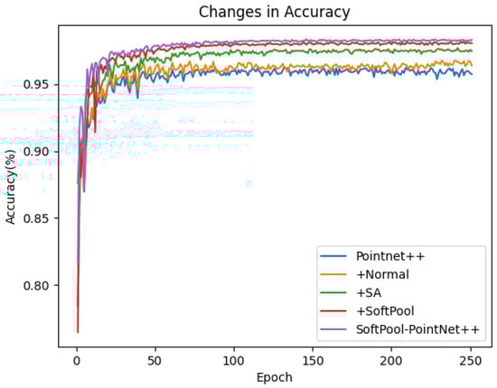 For the ablation experiments, Figure 10 and Figure 11 compare the mIoU versus accuracy changes of the PointNet++ network using different modules with the PointNet++ base network during the training process. As shown in Figure 10 and Figure 11, the improved PointNet++ obtains a better learning ability and has almost converged after about 40 rounds of training, with an optimal mIoU of 96.52% and accuracy of 98.33% in 251 rounds of training. In contrast, the original PointNet++ network only gradually converged after 50 rounds of training, with an optimal mIoU of 92.98% and accuracy of 96.37% in 251 rounds of training. The experimental results demonstrate that the improved PointNet++ network has a stronger learning ability on the pig body point cloud dataset.