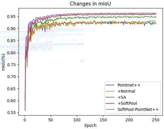The information presented in Table 4 compares the model size and inference time for various modules. The inference time has been increased because of the utilization of the plane fitting method for computing the normal vector information (+Normal). Additionally, +Normal has observed an improvement based on the set abstraction module (+SA). However, due to the increase in the depth of the model, both the model size and inference time have also increased. As the depth and size of a model increase, the inference time also increases. Additionally, the reference time of the model also increases. Moreover, the feature extraction module’s change to SoftPool pooling, as implemented by +SoftPool, could potentially lead to longer processing times per point. This is because it involves an exponentially weighted cumulative activation and the retention of more information in the down-sampled activation mapping. SoftPool increases the inference time; however, it also enhances the network’s performance by retaining more information. When using SoftPool pooling in combination with a deep network model, like SoftPool–PointNet+, the accuracy and mIoU improve by 0.18% and 0.38% respectively. In contrast, the inference time increases by 53.97 ms compared to the SoftPool-only pooling approach, which may be attributed to the fact that each additional SA layer, additional feature extractions, and aggregation operations are required for the point cloud data. These operations include calculating the distance between points, searching for nearest neighbor points, and performing feature transformations, which are relatively time-consuming computational steps. Meanwhile, the FPS of the sampling layer will select the surrounding points to form a region around each center point when selecting the center point and then process them as input samples. This process requires multiple iterations, each of which may involve complex computations, thus increasing the inference time. It is worth noting that improving either the SA layer or the SoftPool pooling approach results in improved performance based on the original PointNet++ model. There is a need to optimize the model for better performance without compromising the segmentation effect.