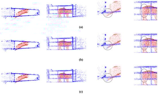 Comparison of point cloud segmentation visualization effect of a pig body in some postures in a complex environment. The first and second columns are top and flat views of the point cloud segmentation visualization of the pig body, the third column is an enlarged view of the point cloud segmentation visualization of the part of the pig body exploring the railing, and the fourth column is a visualization of the segmentation effect of the part of the pig body overlapping with the railing. Circles show the differences between the different visualizations. (a) Manually labeled data of pig point cloud; (b) PointNet++ segmentation results of pig point cloud; (c) Modified PointNet++ segmentation results of pig point cloud.
