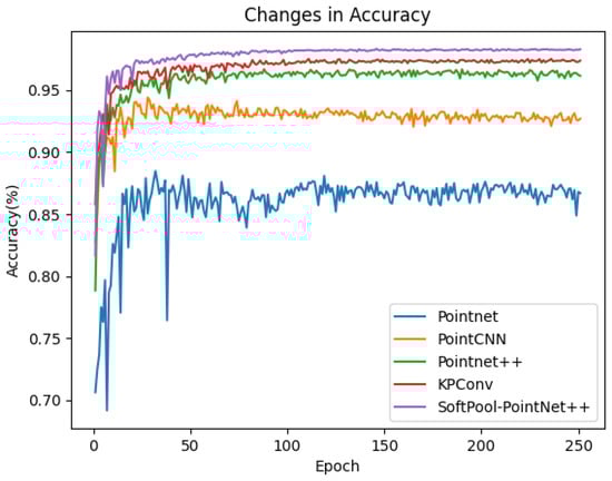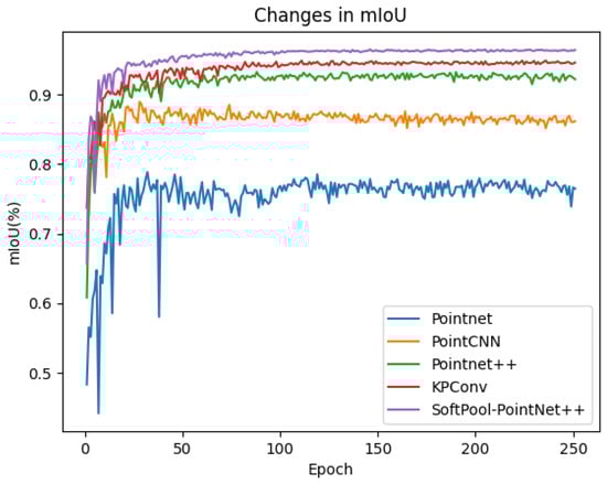 To evaluate the effectiveness and advantages of the method presented in this paper, SoftPool–PointNet++ segmentation results were compared with various point cloud segmentation algorithms on our collected dataset. The comparison results are shown in Table 5. Even though PointNet has the ability to capture the overall information of the point cloud, it struggles to extract detailed local features. This implies that it may not be able to provide enough information when dealing with complex tasks that require a finer-grained analysis of local features, such as object detection or complex scene understanding. PointCNN [30] is an extension and generalization of the classical convolutional neural network and its core operation is X-Conv. X-Conv first weights and displaces the input points to capture the spatial-local associations in the point cloud. Finally, the high-level abstract features are transformed into the final output by one or more fully connected layers. Kernel point convolution (KPConv) [31] is a convolutional neural network for processing point cloud data whose core idea is to perform a weighted summation operation similar to planar convolution through a set of predefined kernel points. The core idea is to perform a weighted summation operation similar to planar convolution through a set of predefined kernel points. KPConv can efficiently capture the spatial structure and local relationships of point cloud data by defining kernel points and correlating relationships. SoftPool–PointNet++, proposed in this paper, has introduced a new methodology to enhance the feature extraction process and improve the segmentation ability. In this approach, the SA layer has been increased to refine the feature information and improve the depth of the model. Then, SoftPool has been utilized to reduce the computation and prevent feature redundancy while retaining more features. Figure 13 and Figure 14 show our method’s mIoU vs. accuracy variation with different point cloud segmentation algorithms for the training process on our collected dataset. In the pig body point cloud segmentation experiments, the SoftPool–PointNet++ network algorithm outperforms the other methods. Figure 13 and Figure 14 illustrate the mIoU versus accuracy variation with different point cloud segmentation.