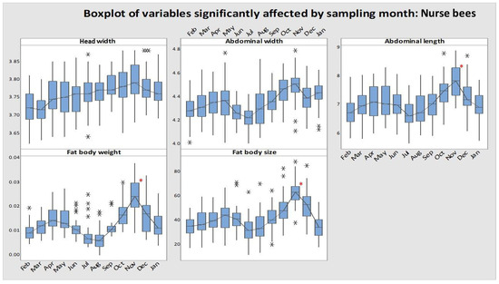 Box plots of Head width (mm), Abdominal width (mm), Abdominal length (mm), Fat body weight (mg), and Fat body size (%) of Apis mellifera ligustica nurse bees according to sampling months. The boxplot represents the interquartile range (IQR = Q3 − Q1) and bars represent first (Q1, top) and third quartiles (Q3, bottom) of metric values. Black “*” represent outliers and the black line represents the mean connect line. Red “*” indicates months significantly different from unmarked months. Feb = February, Mar = March, Apr = April, Jun = June, Jul = July, Aug = August, Sep = September, Oct = October, Nov = November, Dec = December, and Jan = January.