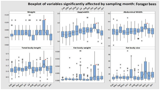 Box plots of Weight (g), Head width (mm), Abdominal width (mm), Total body length (mm), Fat body weight (mg), and fat body size (%) of Apis mellifera ligustica forager bees according to sampling months. The boxplot represents the interquartile range (IQR = Q3 − Q1) and bars represent first (Q1, top) and third quartiles (Q3, bottom) of metric values. Black “*” represents outliers and the black line represents the mean connect line. Red “*” indicates months significantly different from unmarked months. Feb = February, Mar = March, Apr = April, Jun = June, Jul = July, Aug = August, Sep = September, Oct = October, Nov = November, Dec = December, and Jan = January.