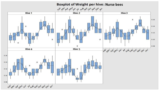 Box plots of the Weight (g) of Apis mellifera ligustica nurse bees according to hive and sampling months. The boxplot represents the interquartile range (IQR = Q3 − Q1) and bars represent first (Q1, top) and third quartiles (Q3, bottom) of metric values. Black “*” represent outliers and the black line represents the mean connect line. Feb = February, Mar = March, Apr = April, Jun = June, Jul = July, Aug = August, Sep = September, Oct = October, Nov = November, Dec = December, and Jan = January.