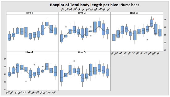 Box plots of the Total body length (mm) of Apis mellifera ligustica nurse bees according to hive and sampling months. Red “*” indicates months significantly different from unmarked months. The boxplot represents the interquartile range (IQR = Q3 − Q1) and bars represent first (Q1, top) and third quartiles (Q3, bottom) of metric values. Black “*” represents outliers and the black line represents the mean connect line. Red “*” indicates months significantly different from unmarked months. Feb = February, Mar = March, Apr = April, Jun = June, Jul = July, Aug = August, Sep = September, Oct = October, Nov = November, Dec = December, and Jan = January.