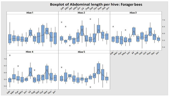 Box plots of the Abdominal length (mm) of Apis mellifera ligustica forager bees according to hive and sampling months. The boxplot represents the interquartile range (IQR = Q3 − Q1) and bars represent first (Q1, top) and third quartiles (Q3, bottom) of metric values. Black “*” represents outliers and the black line represents the mean connect line. Feb = February, Mar = March, Apr = April, Jun = June, Jul = July, Aug = August, Sep = September, Oct = October, Nov = November, Dec = December, and Jan = January.