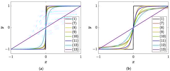 Different sign function approximations are designed to reduce the impact of abrupt changes in the control action; see Equations (7)–(13). The parameter can be adjusted to manipulate the function slope. When this value tends to zero, the approximation is more similar to the sign function; see Figure 3a. When this parameter is increased, the slope of the function becomes steeper; see Figure 3b. This effect helps to reduce the chattering phenomenon [,,,]. However, the sign function in sliding mode control is used to address non-linearities and uncertainties. So if is a big value, the slope of the function is steeper. Therefore, the approximation moves away from the sign function. This could affect addressing non-linearities. After the control design, approximations consist of only substituting the sign function by any approximation. Then, the selection of the value can be performed empirically. However, in some cases, this can be addressed as an optimization problem where the objective is to minimize the error by reducing the non-desired oscillations.