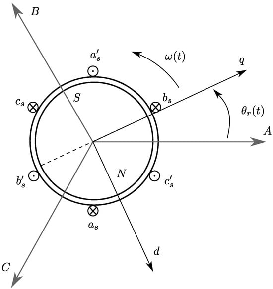 For this study, synchronous motor nonlinear dynamics is transformed using the reference frame , according to Clarke and Park matrices of Equation (14). By converting the nonlinear motor dynamics () into a specific reference frame, often the stationary reference frame, the variables and equations align with the physical orientation of the motor. This transformation can be visualized in Figure 5.