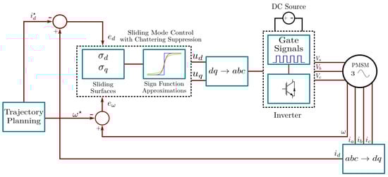 The diagram in Figure 6 describes the process as follows. The speed and current references and are planned as displayed in the next section by Bézier curves. Currents and velocity are obtained from the electrical machine; the three-phase currents are transformed under matrices of Equation (14). Once and are obtained, the tracking errors can be computed and then they are processed on the sliding surfaces , . The discontinuous action in the controllers is substituted in the control action, aiming to mitigate the chattering phenomenon. Finally, the control signals , can be used to generate the control signals that the three-phase inverter will deliver to PMSM. However, this study is only focused on analyzing how approximations can reduce the chattering phenomenon.