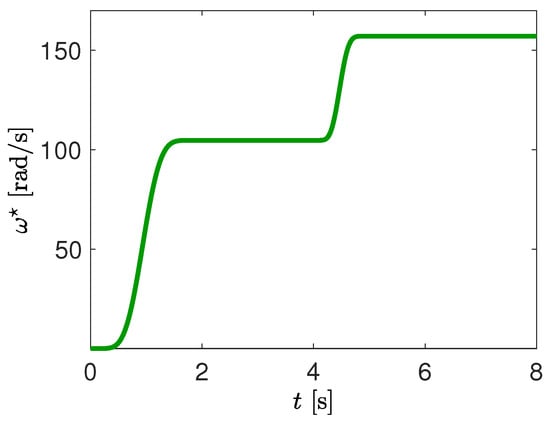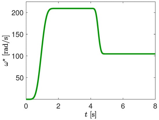 The results obtained in this study validate the proposed control scheme; the integral compensation increases the control robustness against dynamical disturbances, as observed in the generated voltages. Control gains take the values , , and . Moreover, the system response shows an improved behavior in increment or reduction in speed trajectory transitions. This feature allows for applications where the motor must operate at different speeds. Also, various continuous sign function versions were tested in the control scheme to suppress the chattering phenomenon. It is important to notice that Equations (7)–(9), (11) and (13) show the best behavior in the control scheme, since almost a total elimination of this phenomenon is observed for the speed trajectories proposed. A bigger value results in a steeper slope for the sign function approximation. This approach keeps the control law easy to implement where approximations have to be programmed. The adaptive super-twisting reaching law can effectively suppress chattering []. However, the computational cost increases and is complex to implement. In this way, the use of sign function approximations allows for keeping the control law and selecting diverse sliding surfaces. In addition, the approach proposed in [] involves two control law superpositions to address this phenomenon. The presence of uncertain disturbances must be considered within the control design where different approaches are limited.