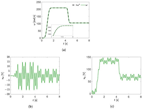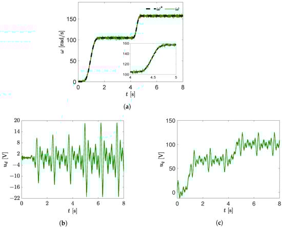 The approximation arc tangent and the general approximation (10) are implemented, revealing a favorable behavior in the system’s response. The speed response, showcased in Figure 13a, distinctly demonstrates good behavior. This desirable property extends to the control signals depicted in Figure 13b,c, displaying minimal chattering in both and voltages. Despite minimal oscillations observed in the final approximation, this version is a solid choice for integration into the SMC.