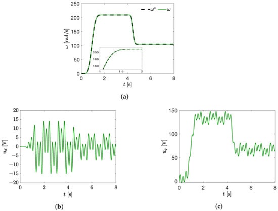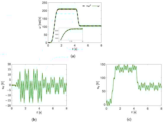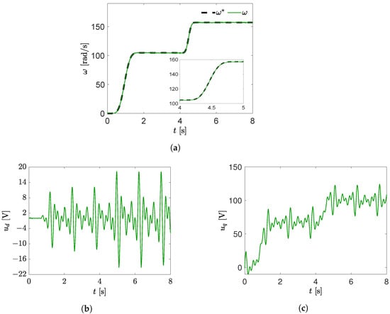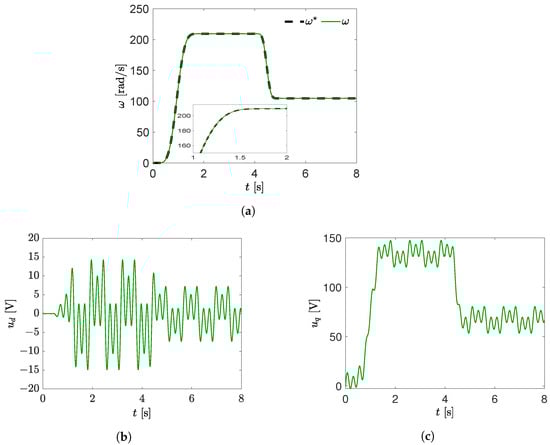 Figure 9 illustrates that using the standard sign function introduces a noticeable chattering effect in the motor’s speed response, as depicted in Figure 9a. Chattering, characterized by rapid fluctuations, affects the system’s performance. These variations in the speed response can lead to undesired vibrations and mechanical stress on the motor and its connected systems. In Figure 9b,c, an analysis of the direct axis and quadrature axis voltages reveals the presence of this phenomenon in each respective control signal. However, it is noticeable that the control scheme exhibits adequate behavior against the variable torque.