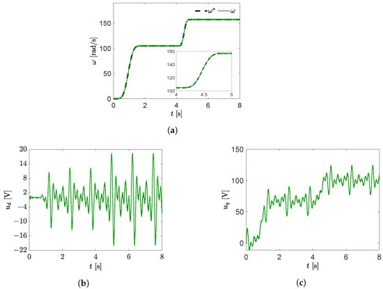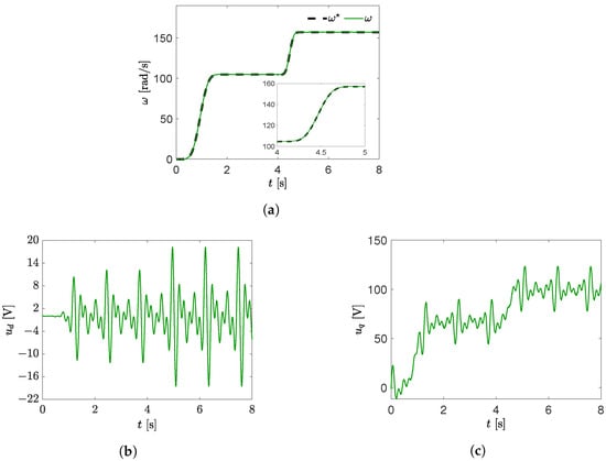 With speed references rad/s, rad/s (2000 rpm), rad/s (1000 rpm), s, s, s, s. Firstly, is evaluated in the control scheme shown in Figure 19; for this new trajectory, the control performs optimally by tracking the speed trajectory, and once again, control signals in Figure 19b,c show chattering due to the standard sign function.