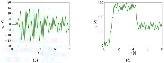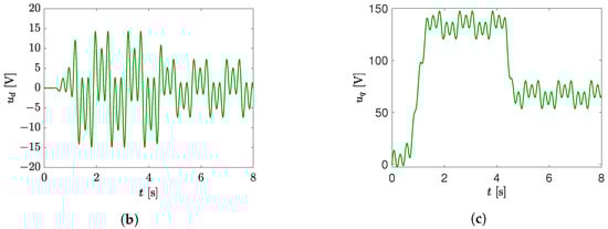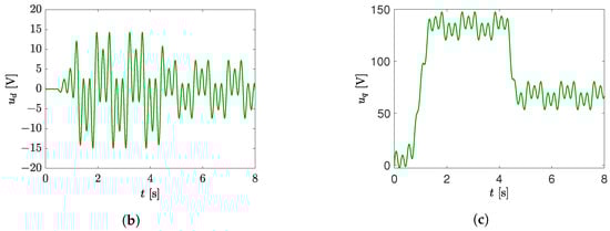 By evaluating approximation hyperbolic tangent, it can be observed that should be increased since the phenomenon is still present in the system’s response, as displayed in Figure 12. Control voltages are in the same situation in Figure 12b,c.