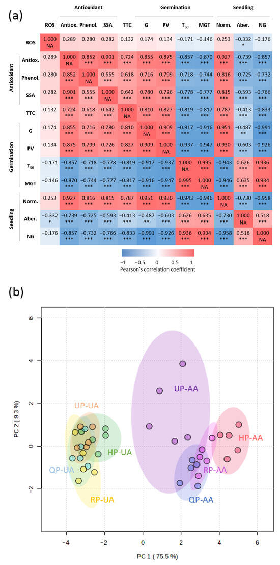 3.5. Correlation of Germination and Seedling Growth Parameters with Antioxidant Response Indicators