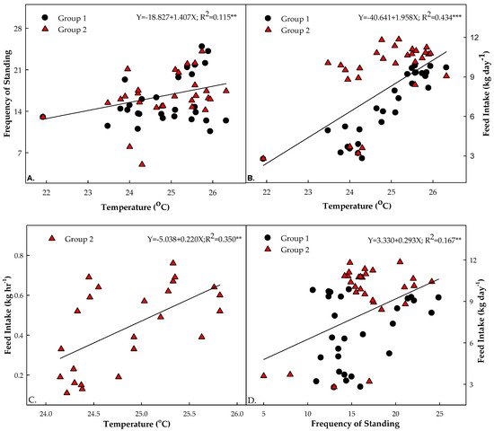 3.4. Correlations between Ambient Temperature, Frequency of Standing, and Feed Intake