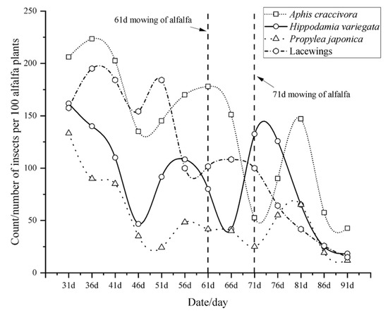 The survey showed that the alfalfa traps were occupied by A. craccivora and their main natural predators, chiefly Hippodamia variegata Goeze, Propylea japonica (Thunberg), and lacewings, with the main species being Chrysoperla carnea Stephens, Chrysoperla sinica (Tjeder), Chrysopa Formosa Brauer, and Chrysopa phyllochroma Wesmael.
