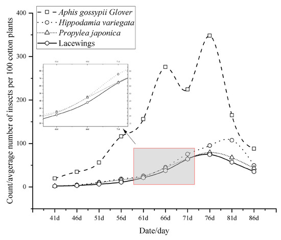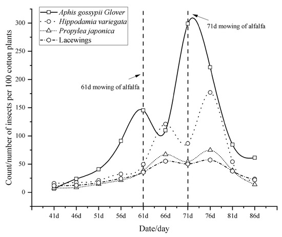 As illustrated in Table 2, primary predators appeared around five days earlier when alfalfa traps were used than in cotton plantations devoid of alfalfa traps. Several species that prey on A. gossypii were observed across the various cotton fields, as displayed in Figure 4. Among these, H. variegata, P. japonica, and lacewings exhibited a notable dominance. On close observation, it was noticed that before any mowing began, there was a slow build-up in the population of such natural predators residing within the cotton fields. Interestingly, after conducting an alfalfa mow in the vicinity on both days 61 and 71, the quantity of these beneficial foes rose dramatically, reaching a peak volume that was maintained consistently thereafter.
