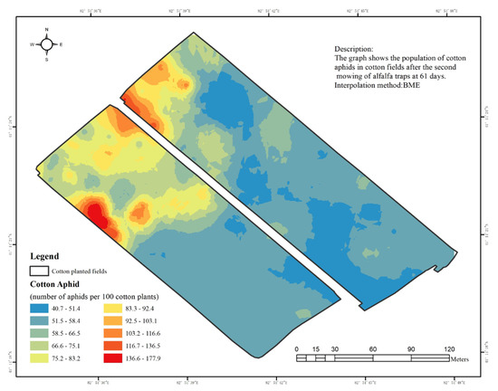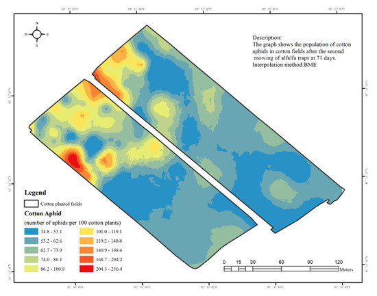 In this study, we utilized the empirical Bayesian kriging (EBK) method for spatial interpolation and simulation of the prediction results [35]. It employs stable data, minimal interactive modelling, and has a smaller standard error of prediction and automatically performs the most difficult steps in constructing an effective kriging model [36]. The cotton aphid distribution map in the cotton field after mowing the alfalfa was generated using the ‘Geostatistical Analyst|Empirical Bayesian Kriging’ function included in the ArcGIS Pro software. The overlap factor was uniformly set to 1.5, the transformations were empirical, and the variability function model was the K-Bessel parameter of trend removal [37]. The image resolution was used as the smallest unit.
