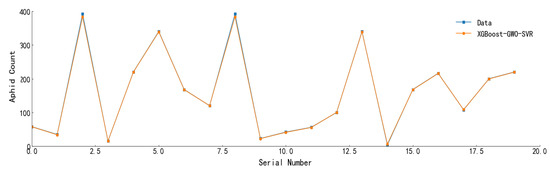 The A. gossypii data from the sample points in the study area were predicted for stability and accuracy using the XGBoost–GWO–SVR prediction model. For validation purposes, 66 days of A. gossypii survey data were selected for this study. Figure 9 shows that the predicted data from the XGBoost–GWO–SVR cotton aphid prediction model based on remotely sensed data closely matched the 66-day field survey data.