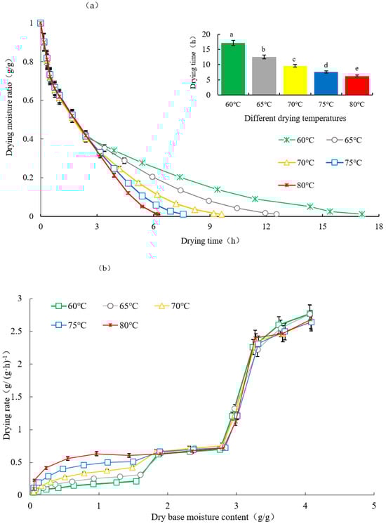 For the third-drying stage of sea buckthorn (MR ≤ 0.4 g/g), the relative humidity was adjusted to 10% and various temperatures were tested. The drying characteristic curves for sea buckthorn are shown in Figure 1a,b, and the variation curves for the moisture ratio with the drying time are shown in Figure 1a. During the third-drying stage (MR ≤ 0.4 g/g), the drying time was reduced from 1026 to 363 min by increasing the drying temperature from 60 °C to 80 °C. Specifically, the drying times at 80 °C were 663, 390, 214, and 90 min shorter than those at 60 °C, 65 °C, 70 °C, and 75 °C, respectively. The drying temperature greatly influenced the duration of the third-drying stage (MR ≤ 0.4 g/g). Higher drying temperatures resulted in a faster moisture decrease and a shorter drying time, in line with the findings of Deng et al. [].