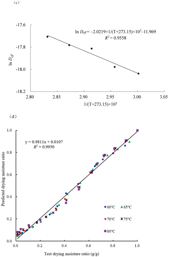 where Rg is a parameter related to the geometric size of the material, equal to 13.1 m2/s for spherical sea buckthorn; r is the equivalent radius of sea buckthorn, set at 0.6 cm; and Dcal is the effective moisture diffusion coefficient estimated during sea buckthorn drying.