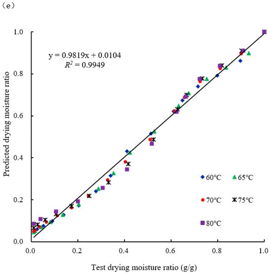 The Page model has high prediction accuracy and can be used to predict changes in the moisture ratio during sea buckthorn TH-IRHAD at different drying temperatures. This was demonstrated by validating the predicted and experimental values of the Weibull and Page models (Figure 1d,e).