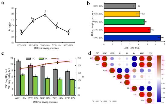 (a) Rehydration ratio curves of sea buckthorn at different drying temperatures. (b) Specific energy consumption (SEC) of sea buckthorn at different drying temperatures. (c) Content of antioxidant active substances in sea buckthorn at different drying temperatures. (d) Correlation matrixes between the determination parameters. Note: Different letters indicate significant differences in the samples (p < 0.05).