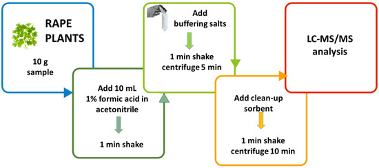 Young oilseed rape plants contain considerable amounts of chlorophyll, which might act as an instrumental interference. Thus, further purification of extraction solutions was needed. Extraction of analytes using the “dispersive SPE (d-SPE) clean-up protocol” facilitates their proper sample clean-up [59]. Therefore, in the present study the d-SPE clean-up protocol was used for the purification of extracts of young oilseed rape plants.