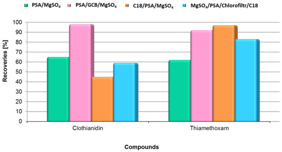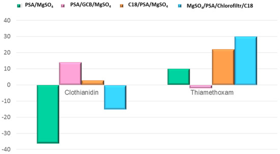 Matrix effects of thiamethoxam and clothianidin were obtained using four different d-SPE clean-up protocols: (i) PSA/MgSO4, (ii) PSA/GCB/MgSO4, (iii) C18/PSA/MgSO4, and (iv) MgSO4/PSA/Chlorofiltr/C18.