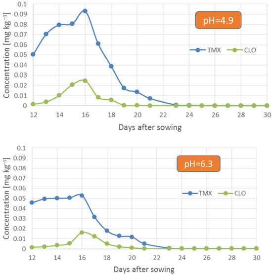The residues and dissipation rates of thiamethoxam and clothianidin in oilseed rape plants are summarized in Table 5 and shown in Figure 5. Seeds before sowing were analyzed and the dosage was checked. The initial concentration of thiamethoxam in seeds was 0.315 mg kg−1. For thiamethoxam and its metabolite, two stages may be distinguished in the process of their decay in a plant. The first stage lasted until the 16th day of the experiment, in which the concentration of compounds in a plant was growing, and the second stage started from the 16th day, in which the concentration was declining. Depending on the soil pH, differences in compound concentrations were recorded. Deposits of thiamethoxam and clothianidin were higher in a plant from an acid soil location (Figure 5). In the case of this soil, a gradual but marked increase in thiamethoxam and clothiani-din concentrations was recorded in the plant at 5 initial dates, i.e., day 12, 13, 14, 15, 16. On the other hand, in the case of soil with pH = 6.3, the concentration of thiamethoxam in the plant on these days was more even and remained at a similar level within 0.05 mg kg−1. However, between days 15 and 16, a slight increase in the concentration of clothianidin was observed in the plant.