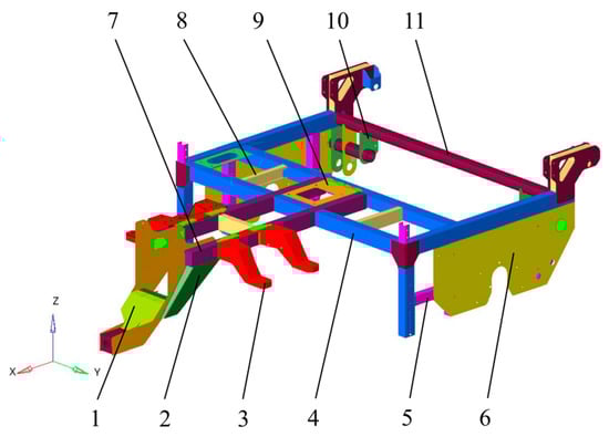 12]. Research on the vibration characteristics of residual film recycling machines is challenging yet important. To a certain extent, solving the resonance problem can reduce the energy loss of the machine, improve the operation efficiency, and achieve cost reduction and income increase. However, studying the vibration characteristics of the frame system of the straw-crushing and residual film recycling machine with the main purpose of reducing weight and noise is important because it provides a theoretical basis for the in-depth study of the vibration characteristics of the subsequent agricultural machinery.