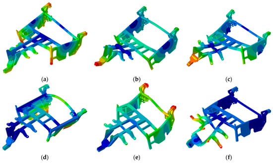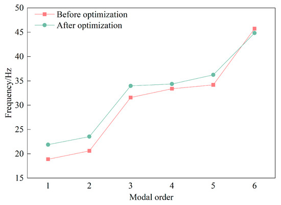 Figure 18 compares the first six order modal frequencies of the finite element before and after the frame optimization. The first six natural frequencies of the frame are adjusted to 21.89 Hz, 23.55 Hz, 33.98 Hz, 34.36 Hz, 36.24 Hz, and 44.85 Hz, respectively, all of which avoid the external excitation frequency.