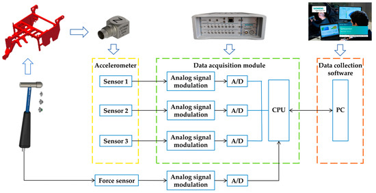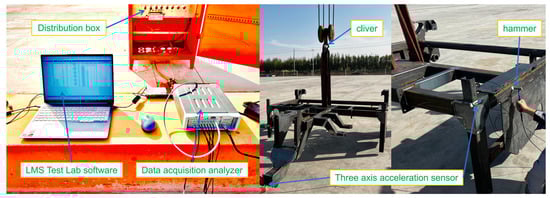 Figure 6) in this paper comprises an impact hammer, a three-axis acceleration sensor, a SCADAS data acquisition analyzer, and LMS Test-lab 2021 signal processing and analysis software. The impact hammer is applied to the frame pulse excitation, and the analog signal is fed back to the data acquisition analyzer through the three-axis acceleration sensor. The data acquisition software processes the signal and obtains the frequency response function. The details of the test equipment are shown in