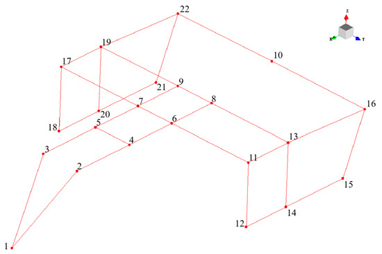 Figure 7) to ensure that the measuring points can reflect the shape of the frame structure and ensure that the modal vibration mode of the frame can be fully described. Because the reference point (fixed excitation to place the sensor point) should be able to avoid the node and be easily excited, measuring points 1, 11, and 22 are selected as the reference points. Each reference point is set with a three-axis acceleration sensor, and the remaining points are response points.