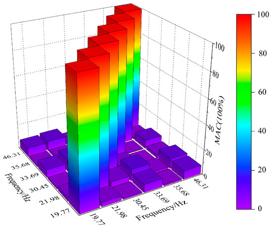 Figure 12. The MAC confidence criterion compares two modal shape vectors with any scale. The MAC value should be close to 100% under the same order mode, and the MAC value should be 0 under different order modes. The MAC confidence criterion matrix is expressed as follows: