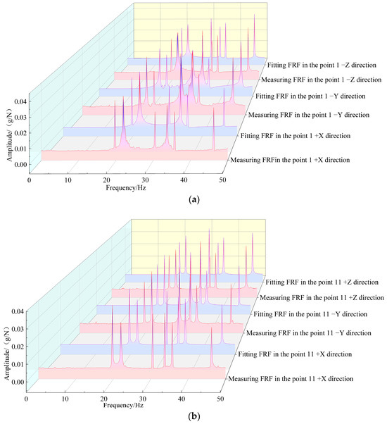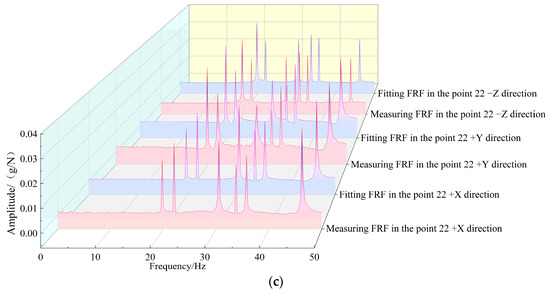 Figure 13 shows that the trend between the three-way measurement FRF curve of the reference point (points 1, 11, and 22) and the fitted FRF curve is relatively close. The difference of the corresponding amplitude (g/N) at the same frequency (Hz) is small, reflecting that the FRF curve between the measuring point 2 and the reference point has a high correlation and a small error; that is, the frequency response confidence is high.
