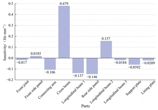 The sensitivity analysis of the 10 components of the frame is conducted according to the requirements of the operation stability of the straw-crushing residual film recycling machine and the results of the modal analysis. The thickness of the frame components is taken as the design variable, and the volume of the frame structure is taken as the optimization target. The lower limit of the first-order modal frequency optimization result is added to calculate the sensitivity of the first-order modal frequency of the frame relative to the thickness of each component. The results are shown in