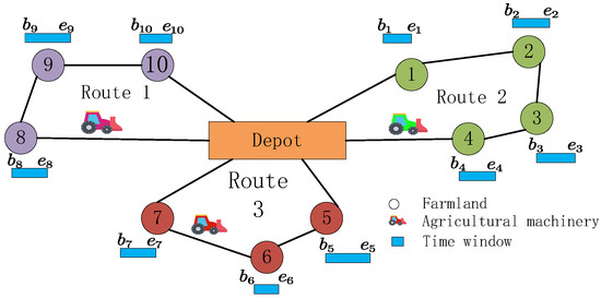 Generally speaking, agricultural machinery managers provide service for farmers with small-scale farms. Figure 1 shows an example of agricultural machinery scheduling; the blue bars are the required time windows for different farmlands. Assume and represent the beginning and the ending of the time window. There are three agricultural machines assigned to 10 farmlands. Each piece of agricultural machinery departs from the depot, and after processing several farmlands, it is required to return to the depot. For instance, agricultural machine 1 departs from the depot and subsequently processes fields No. 10, No. 9, and No. 8 before returning to the depot. From the perspective of farmers, time windows are best to satisfy while minimizing makespan for machine managers. In general, the path among farmlands is always asymmetric with different road conditions, such as uphill and fall pavement. Therefore, it is a valuable study to investigate how to schedule agricultural machinery in extreme weather and other emergencies to complete all farmlands on time.