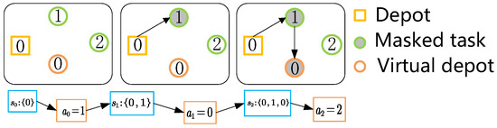 State. We set to denote the state at time step t, which denotes the partial solution created at time step t. In other words, the solution is constructed iteratively by . Assuming T represents the total time steps, is our final solution. As shown in Figure 2, there are two farmlands and two agricultural machines. Virtual depot 0 and depot 0 both denote the same depot. The initial state denotes the current machinery that would depart from the depot. With the action , we can obtain . And is obtained by , which represents the solution of the current machinery is finished. Since the studied problem includes many machines, , , and here are just partial solutions. The reason for adding virtual depot 0 is to partite solutions efficiently in the decision-making process, which is elaborately described in Section 3.2.2. The number of virtual depots depends on the number of agricultural machines.