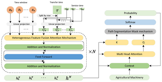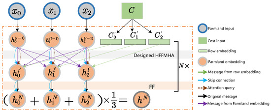 Existing heterogeneous feature fusion based on attention is always used in image processing, which segments images into grids and calculates the weights of a grid and its neighborhoods for feature fusion. Since the study problem considers not only the time window but also the transfer cost among farmlands, these heterogeneous features make the existing feature fusion not work well. Furthermore, with the asymmetric paths in our paper, the transfer cost of each farmland from the cost matrix needs to be exactly selected for feature fusion, which is ignored in existing feature fusion. In this paper, we design a heterogeneous feature fusion attention mechanism in the encoder to fuse the asymmetric paths and the transfer cost efficiently. In Figure 4, the input farmland time windows and the cost matrix C are linearly mapped into initial embeddings with a dimension of 128. Specifically, the cost matrix C needs to be split into rows, where each row corresponds to a respective farmland embedding of transfer cost. Meanwhile, the corresponds to the depot embedding of . Then, the embeddings go through the N encoder block, each consisting of a designed multi-head attention sub-layer and a feed-forward sub-layer.